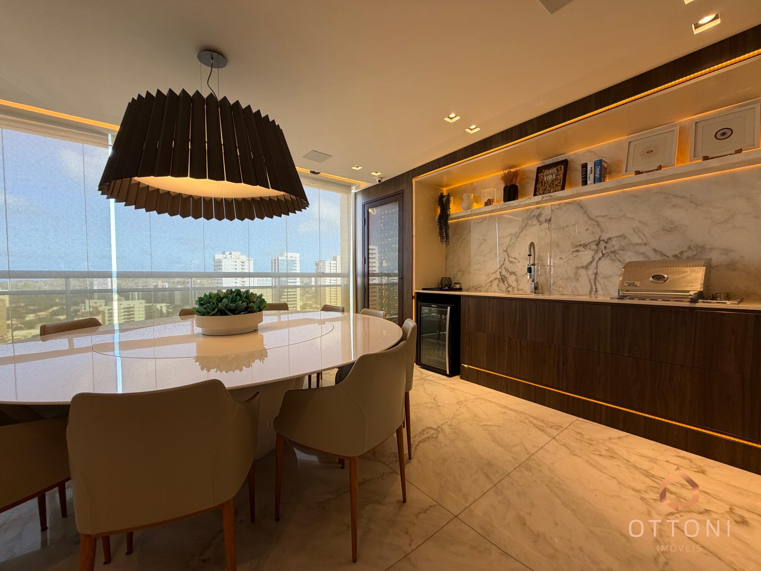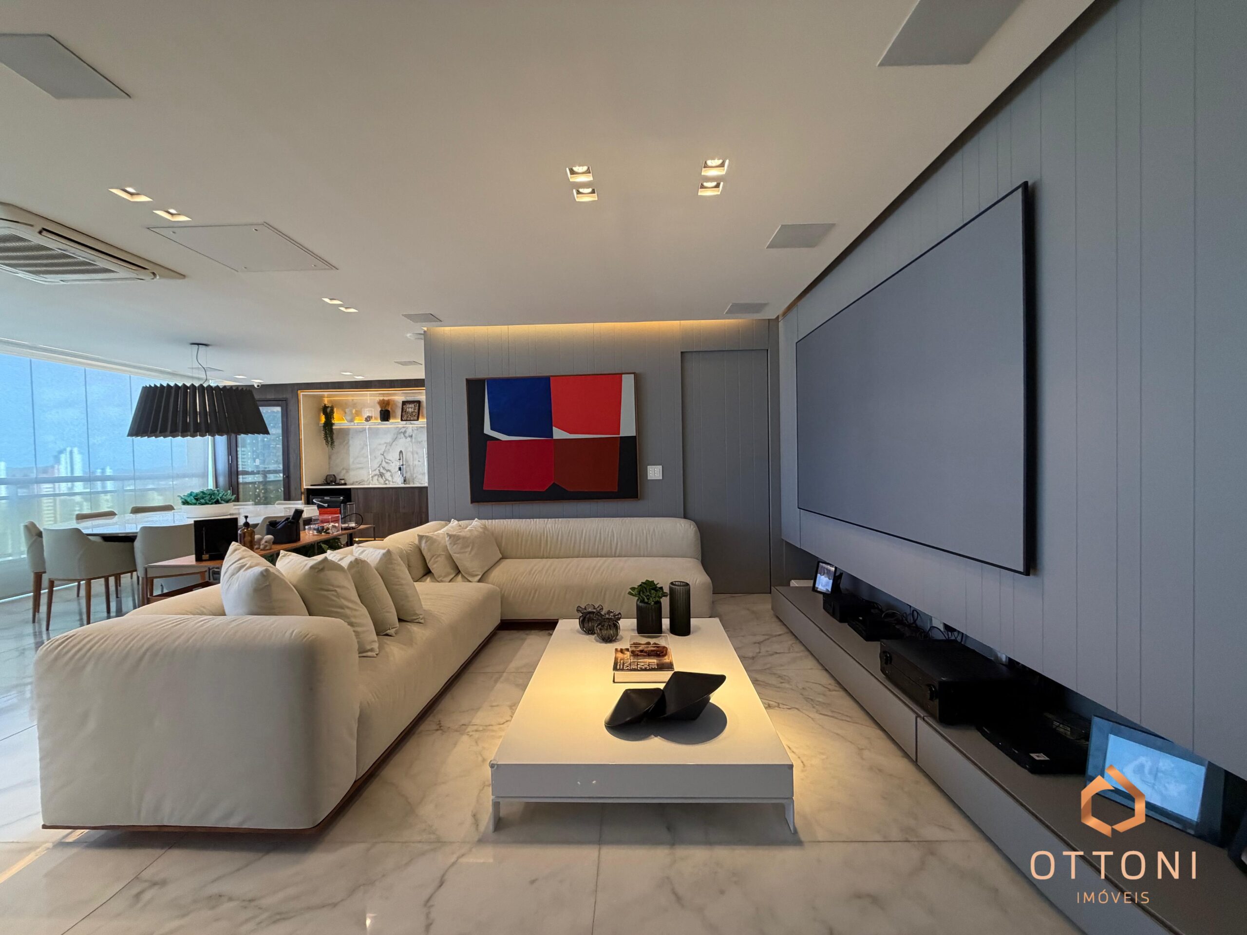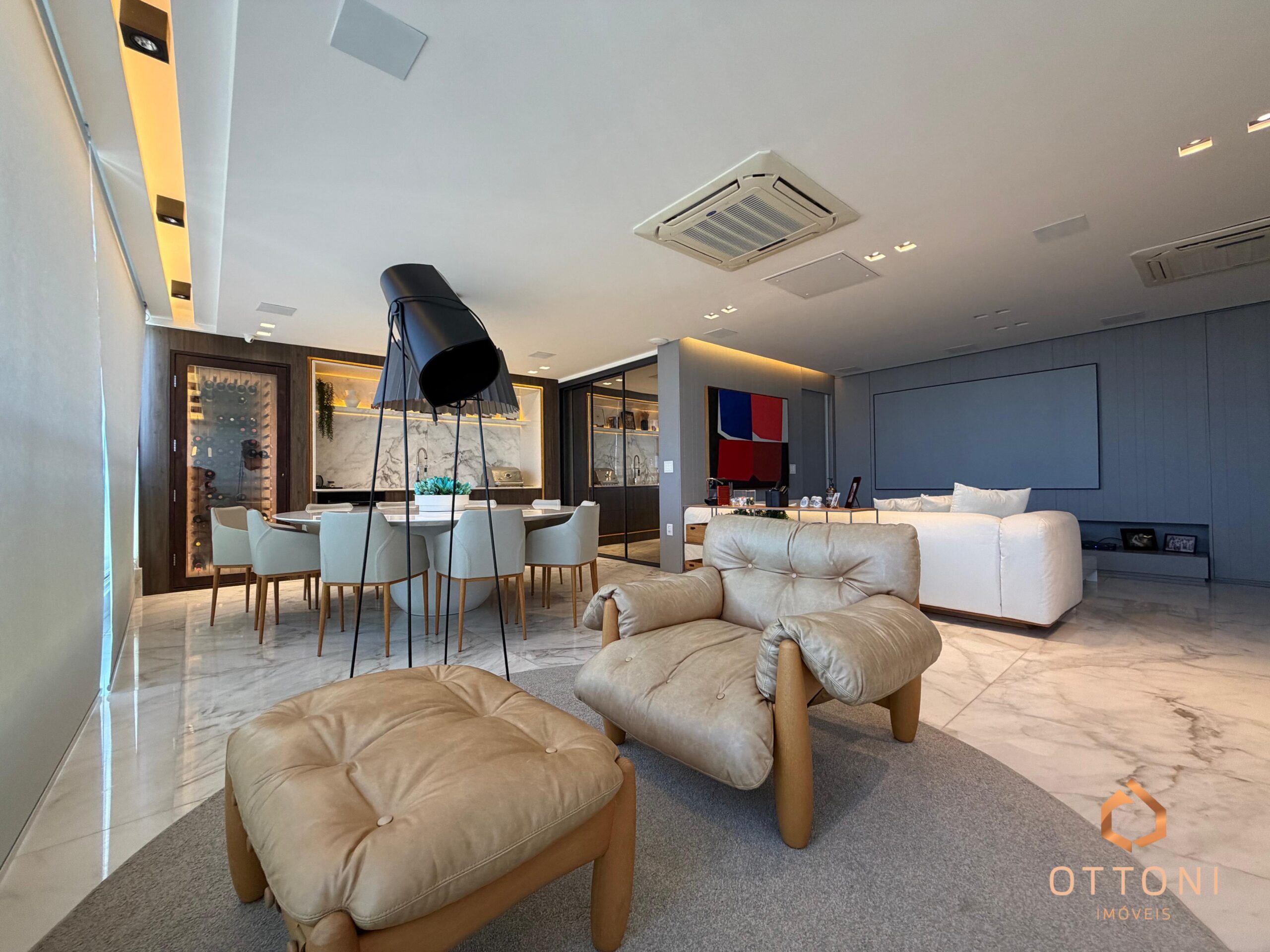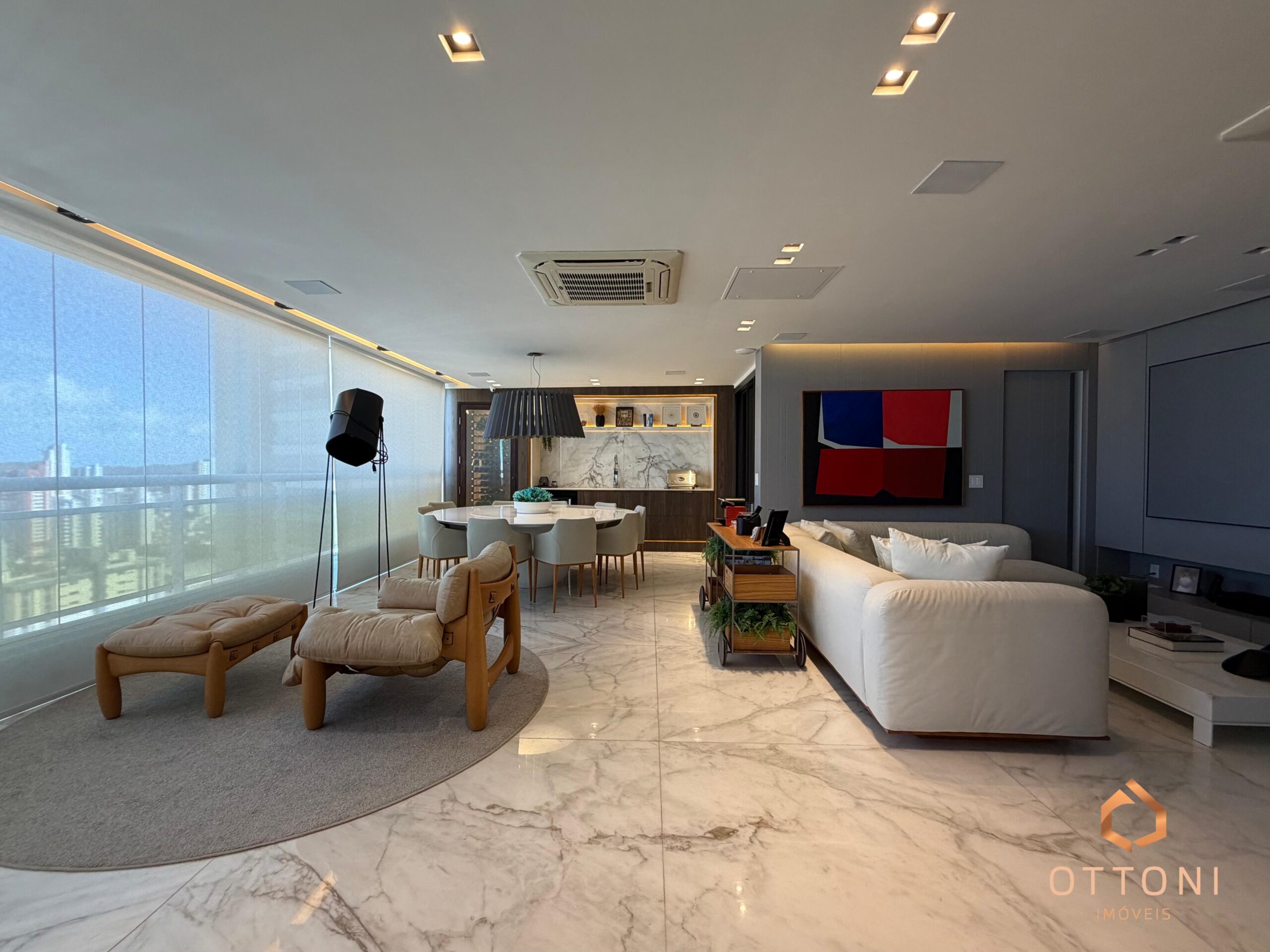 Destaque para piso em mármore, móveis planejados Bontempo, cortinas automatizadas e Sistema TV Flap.