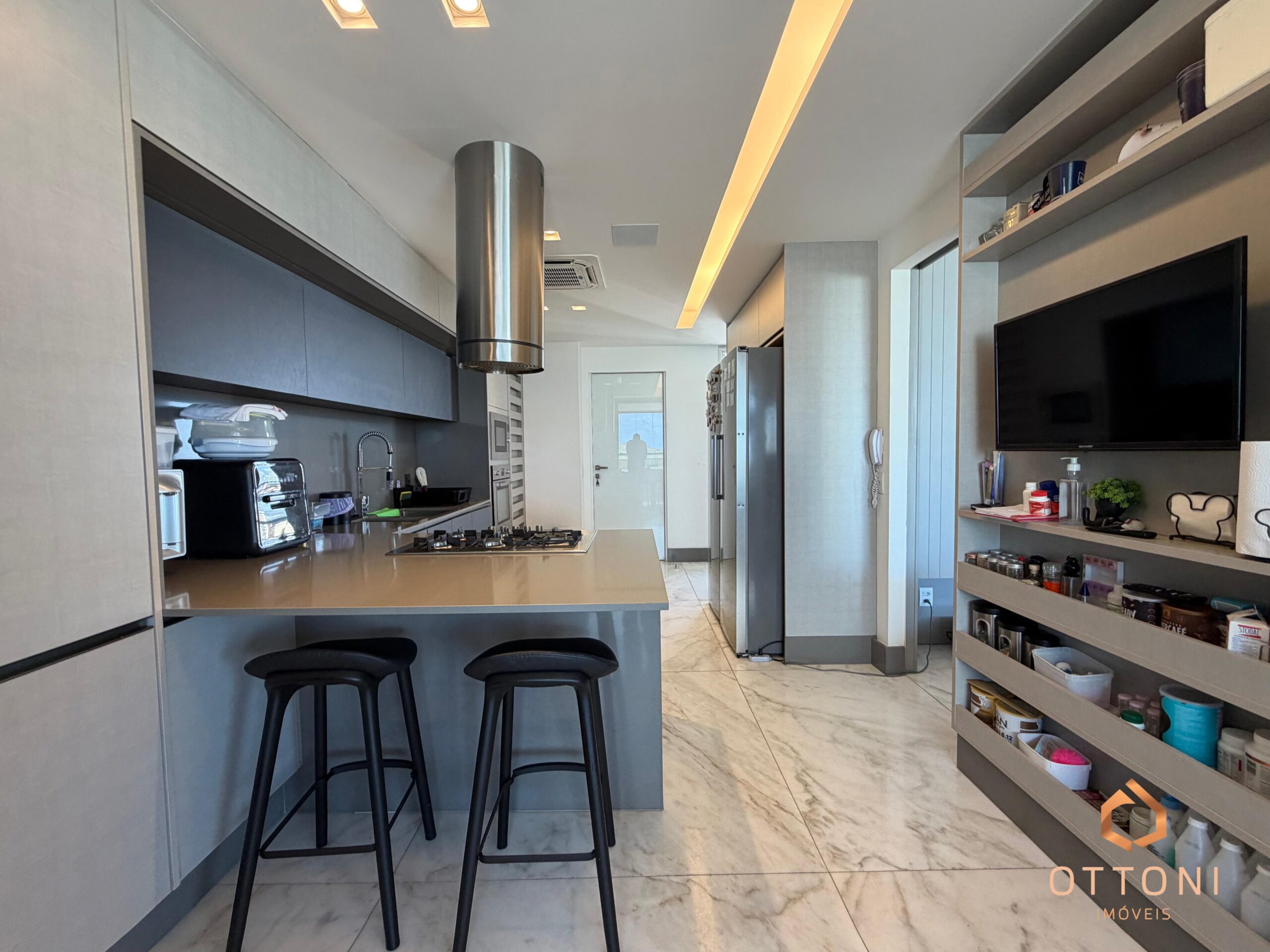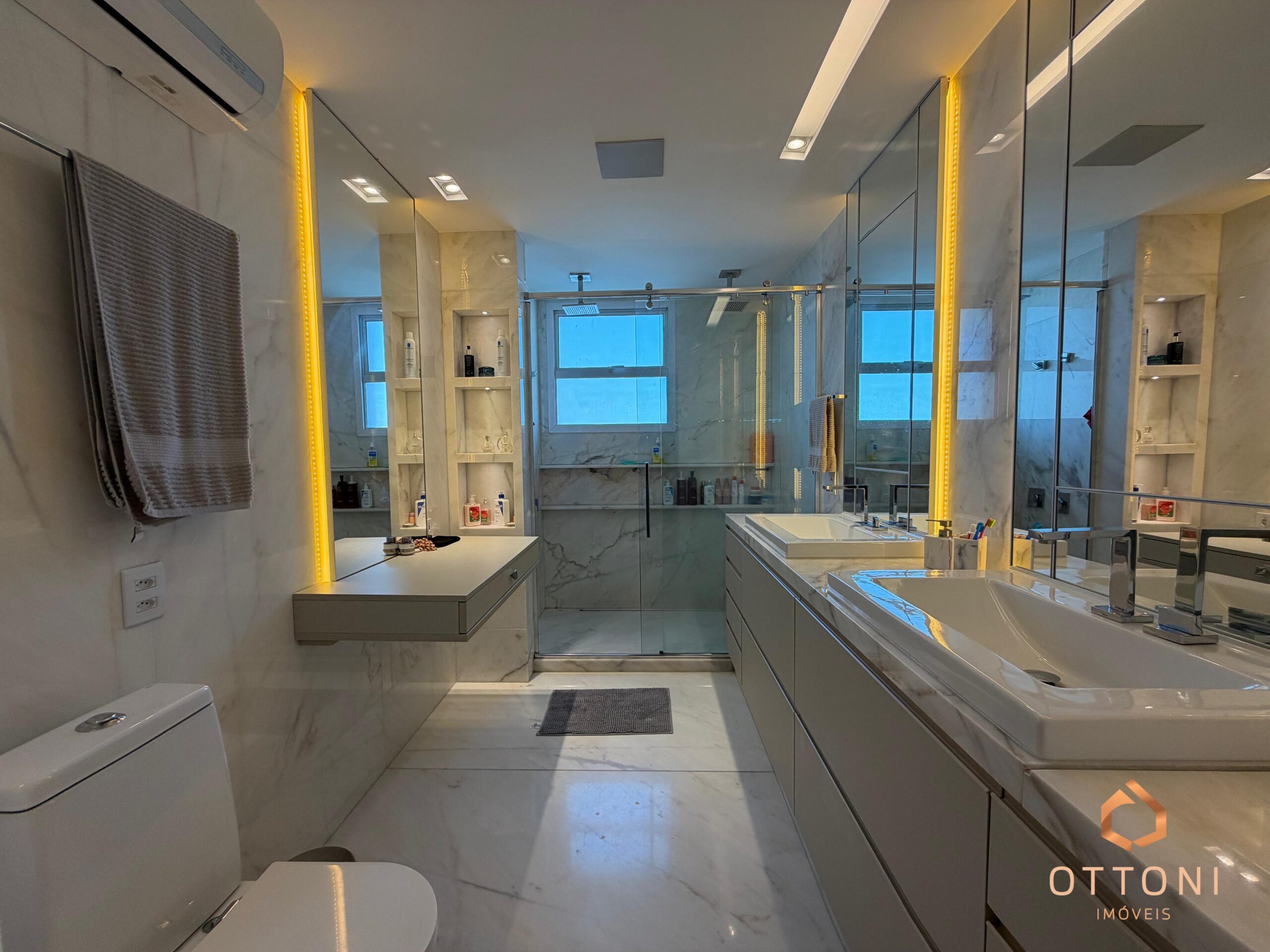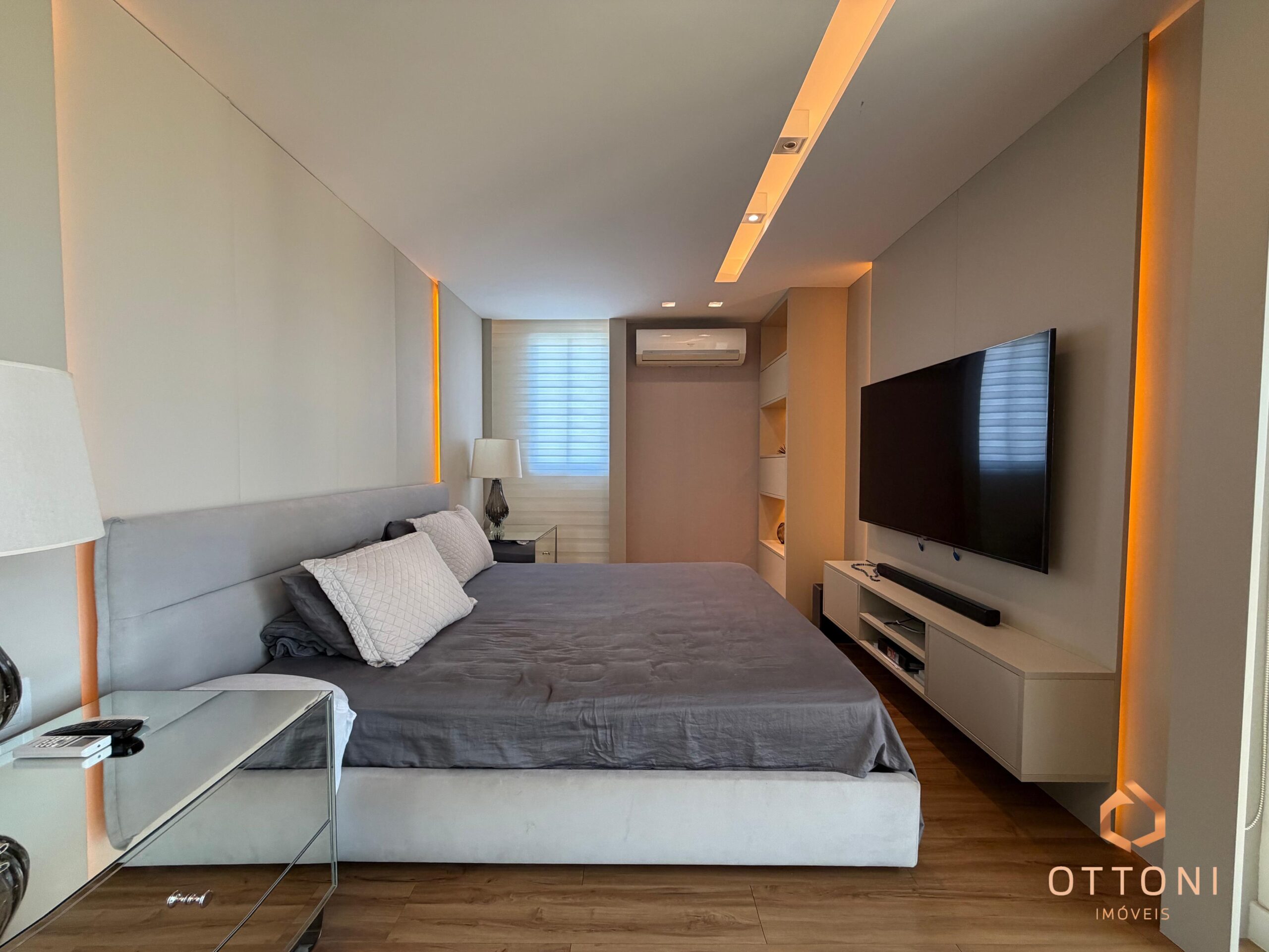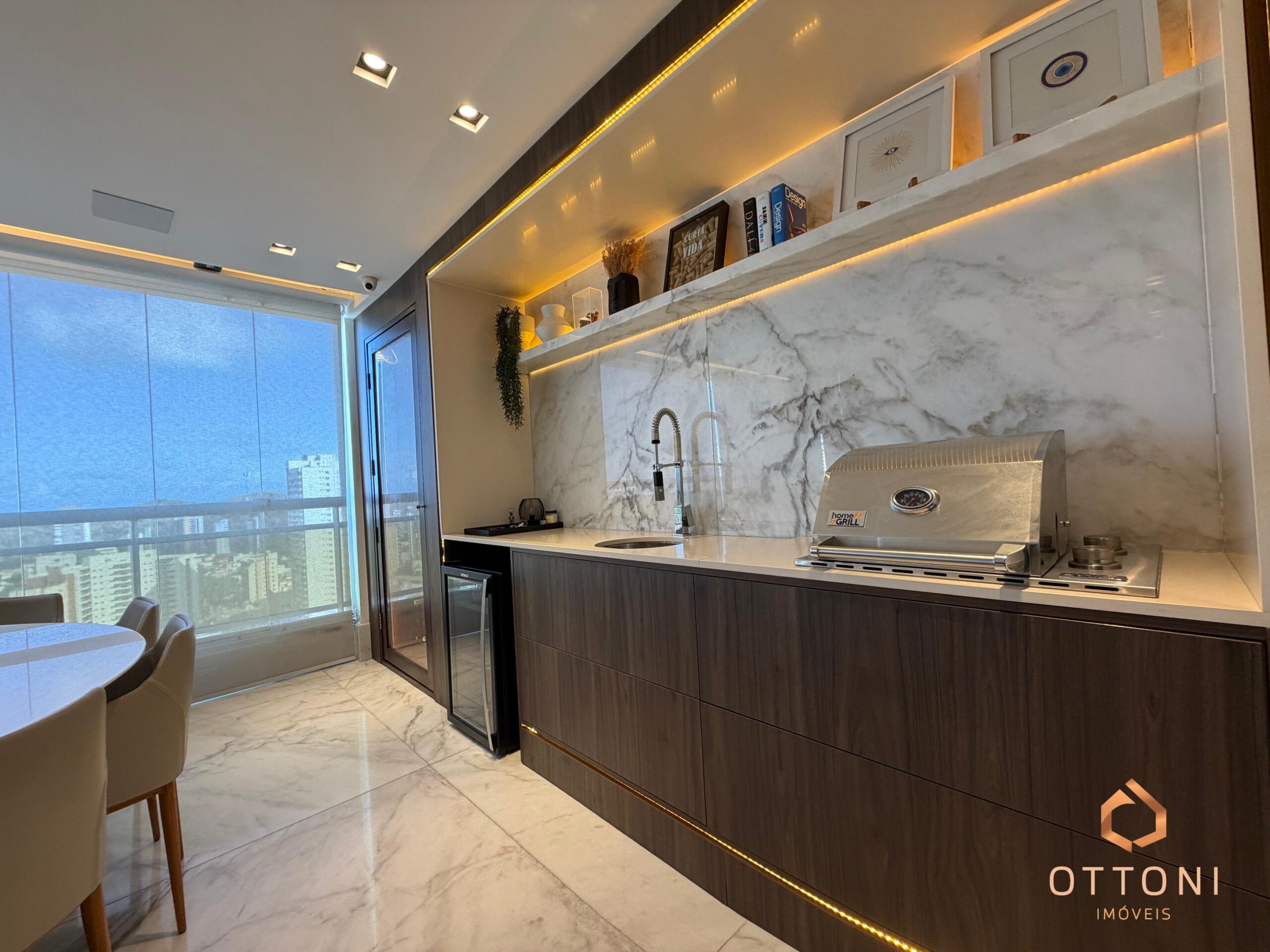 Destaque para piso em mármore, móveis planejados Bontempo, cortinas automatizadas e Sistema TV Flap.